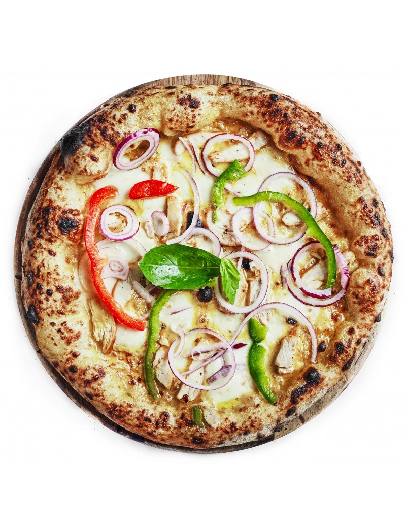 Base sauce curry, mozza, poulet mariné, oignons et poivrons frais.